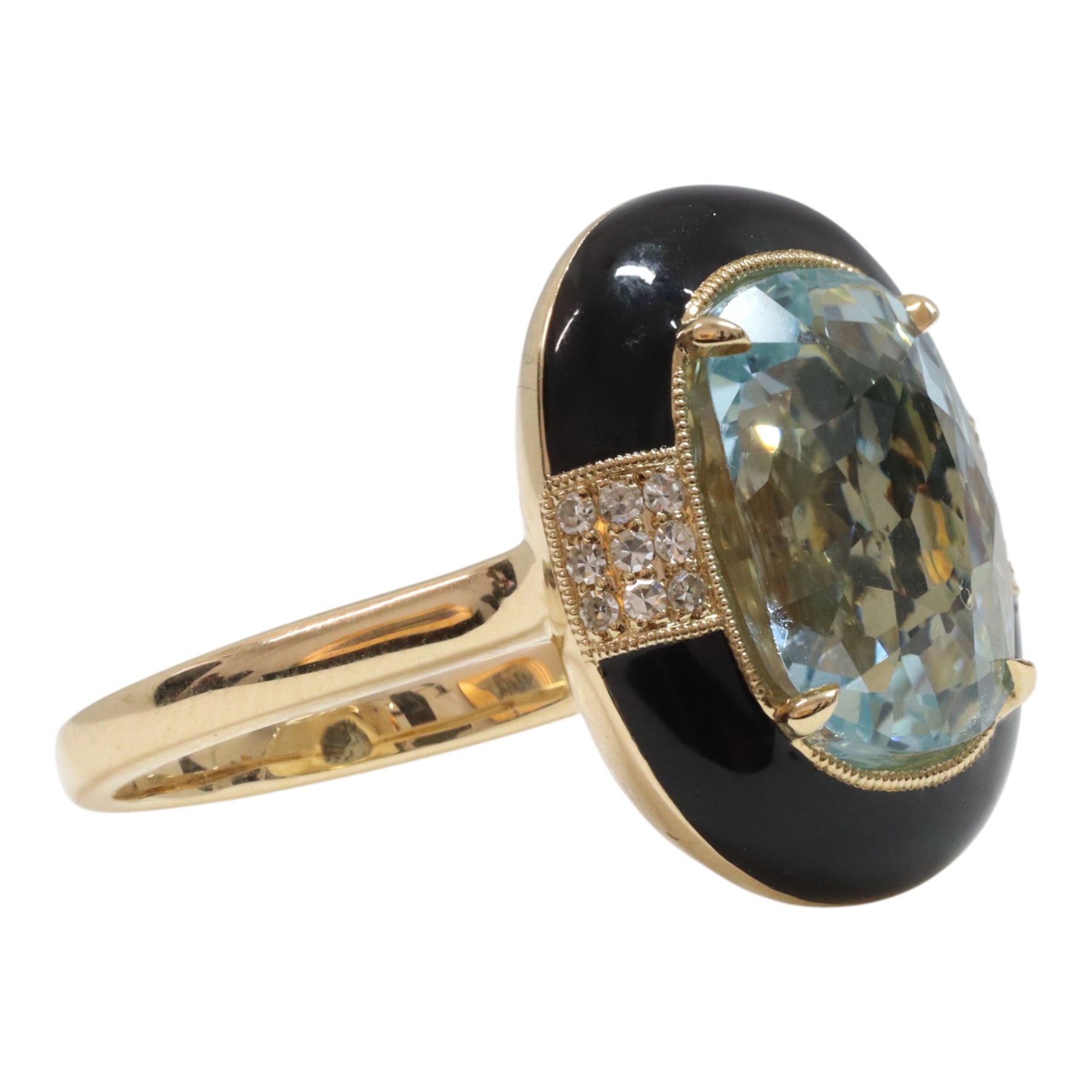 14ct yellow gold aquamarine, diamond and onyx dress ring featuring one (1) cushion shape four claw set aquamarine decorated by eighteen (18) round brilliant cut micro claw set diamond along onyx on a decorative setting with an underrail and upswept shoulder on a2.16mm half round band.