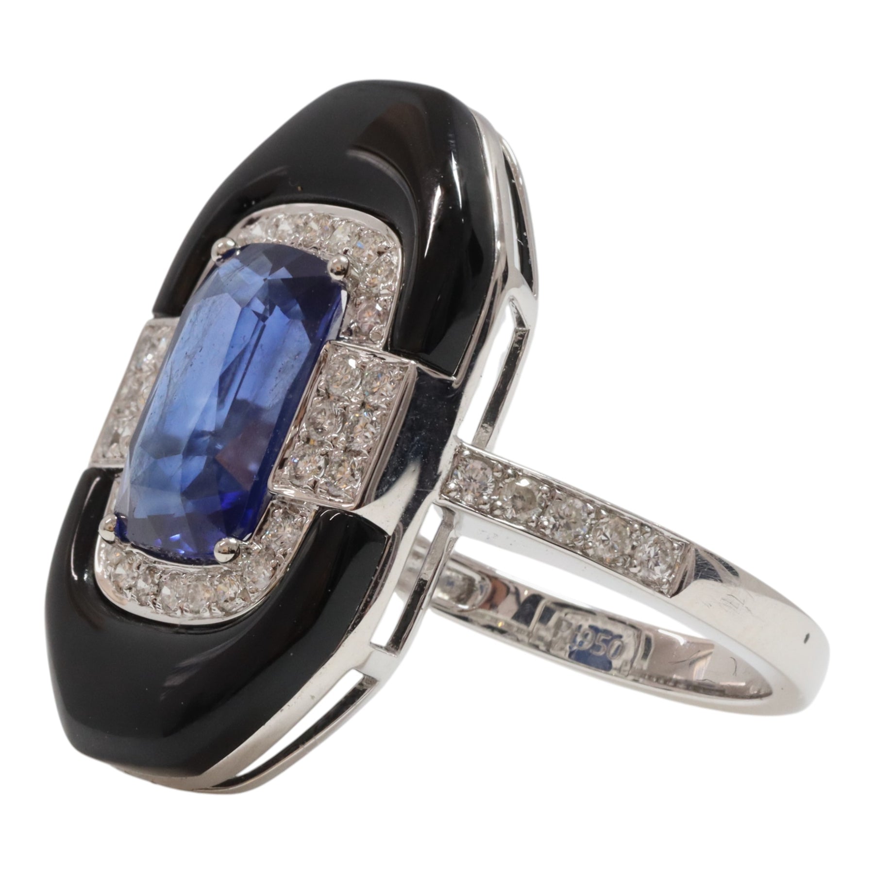 One ladies - platinum dress ring, narrow, low half round, parallel shank with open back, 4 claw setting with a diamond and onyx halo, polished finish, stamped (PT950). The item contains: