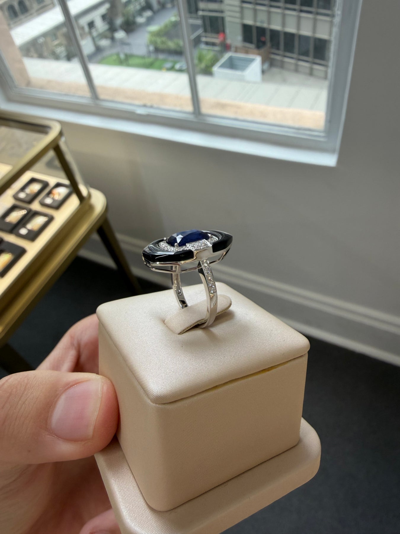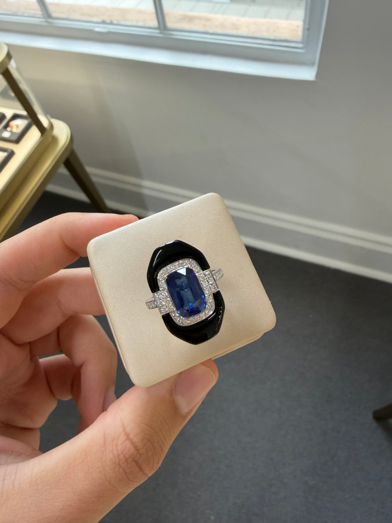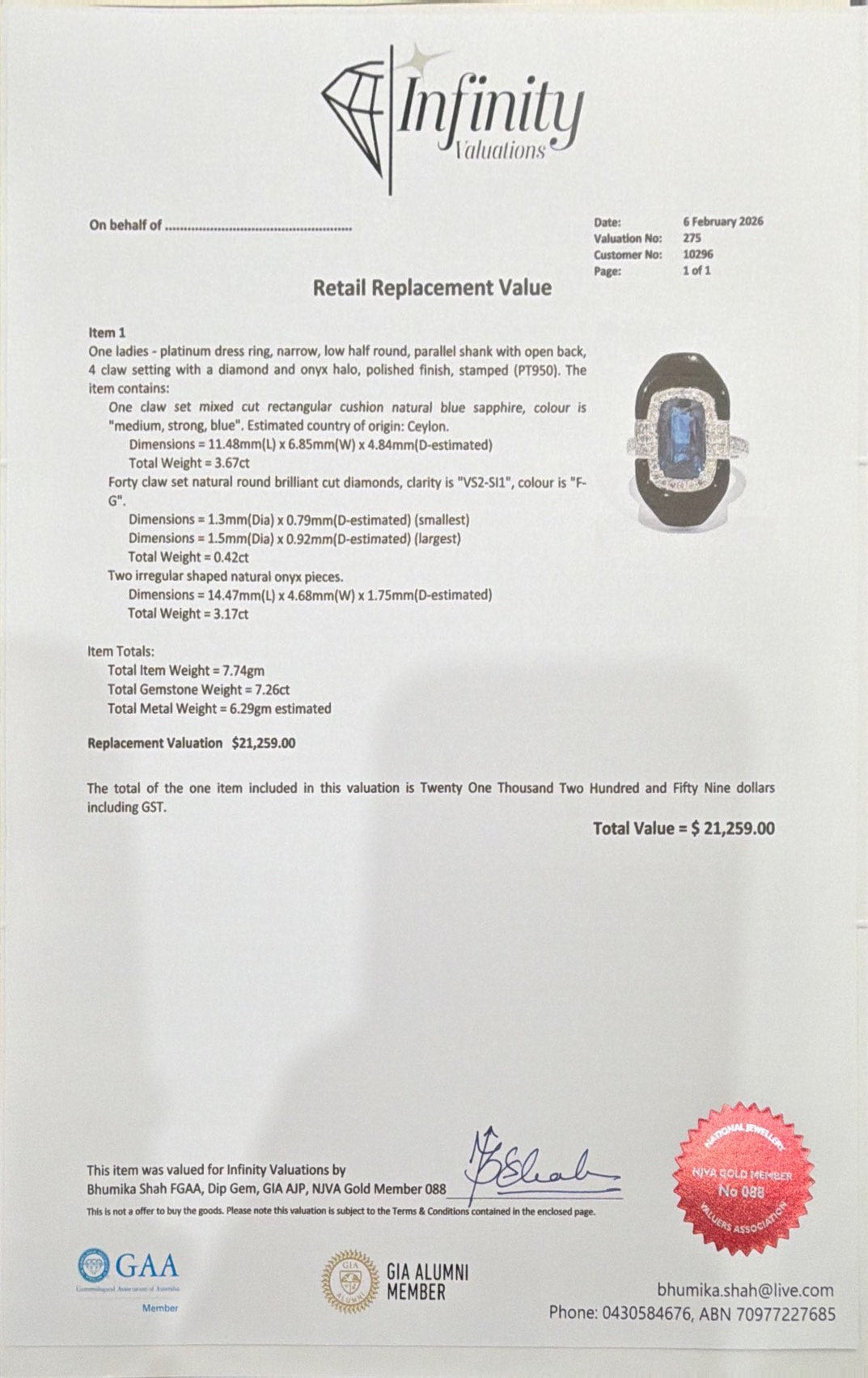 "medium, strong, blue". Estimated country of origin: Ceylon.