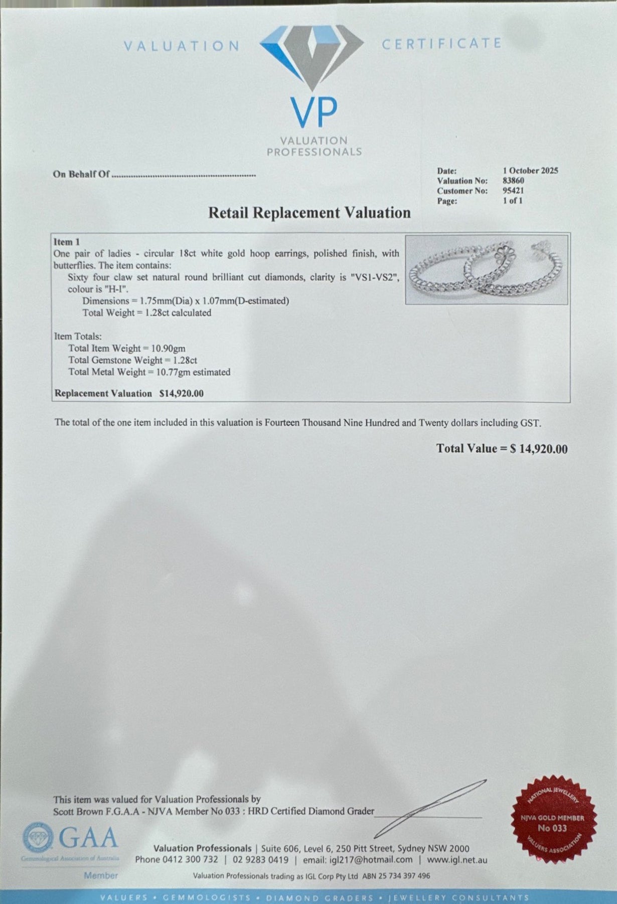 The total of the one item included in this valuation is Fourteen Thousand Nine Hundred and Twenty dollars including GST.