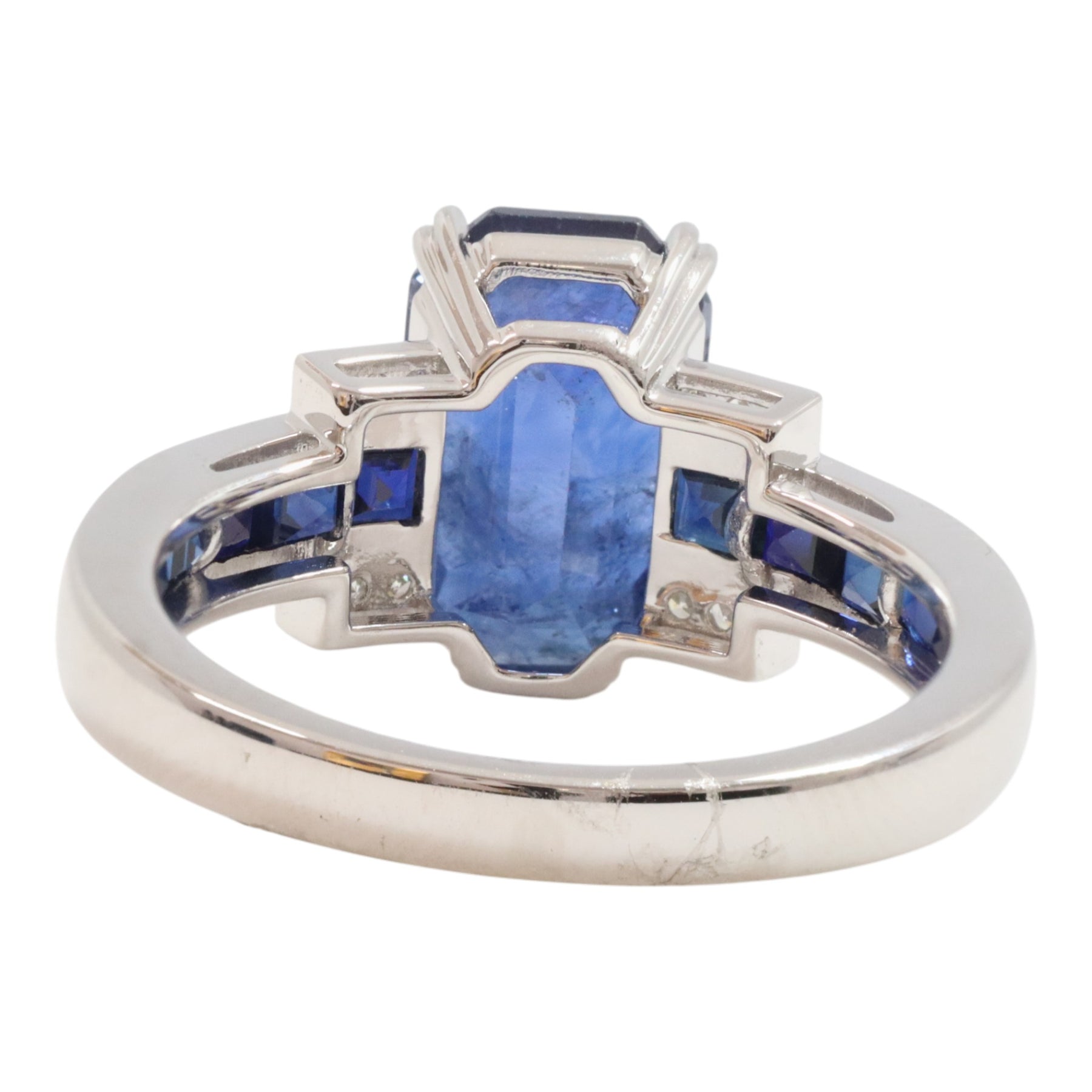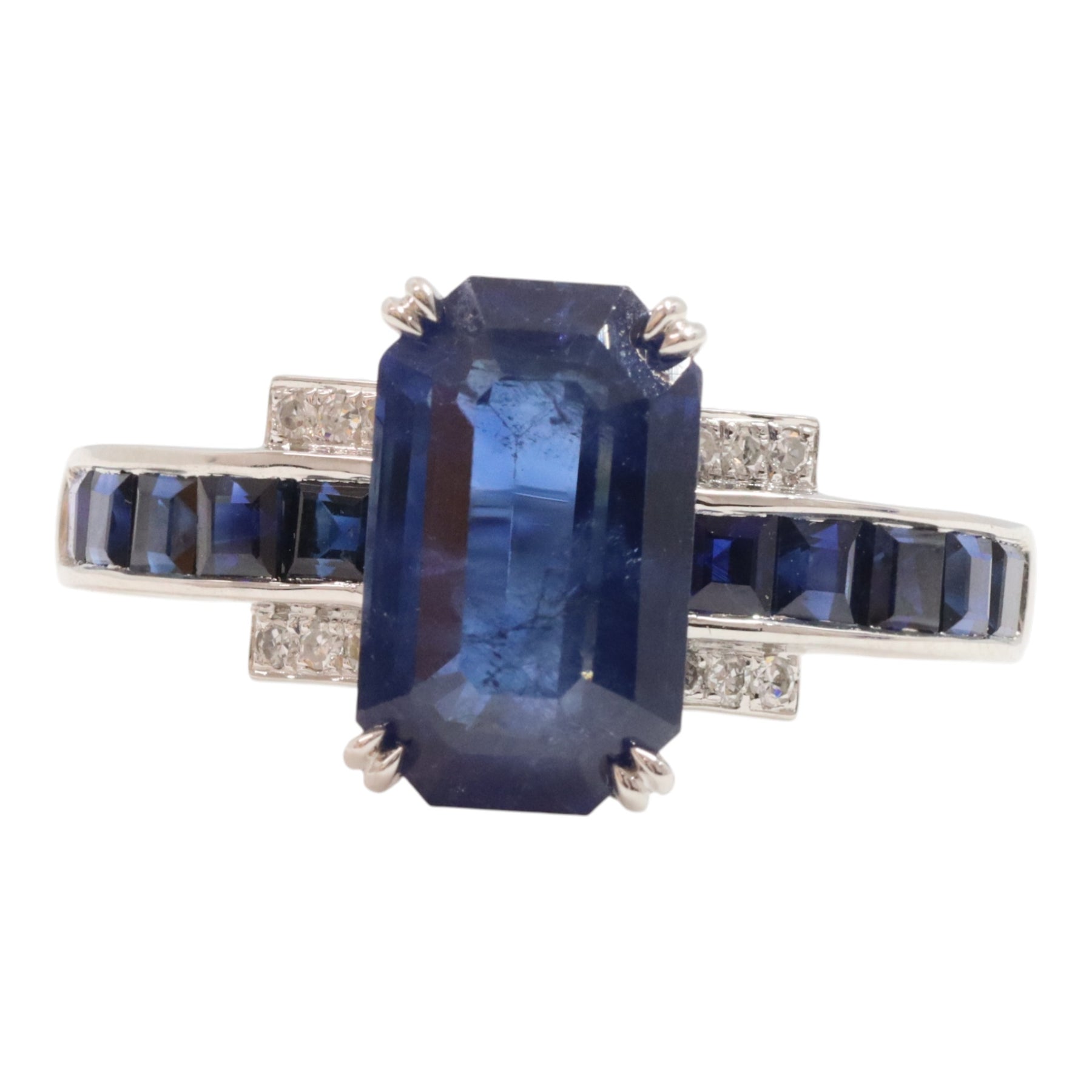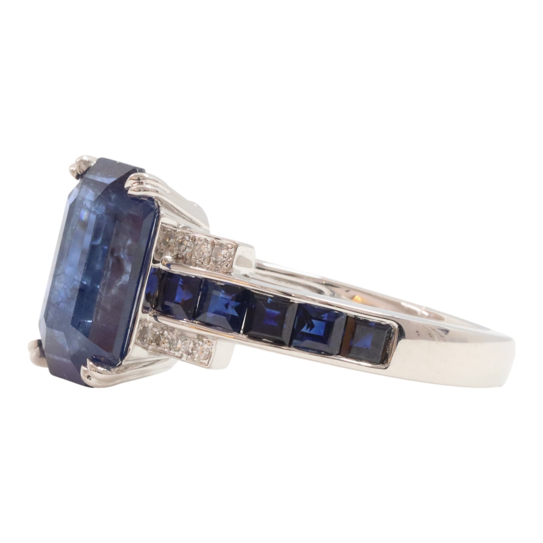 14ct white gold Ceylon sapphire and diamond dress ring featuring one (1) emerald shape four claw set sapphire on a basket setting with an upswept shoulder contain ten (10) square shape channel set sapphire along with twelve
