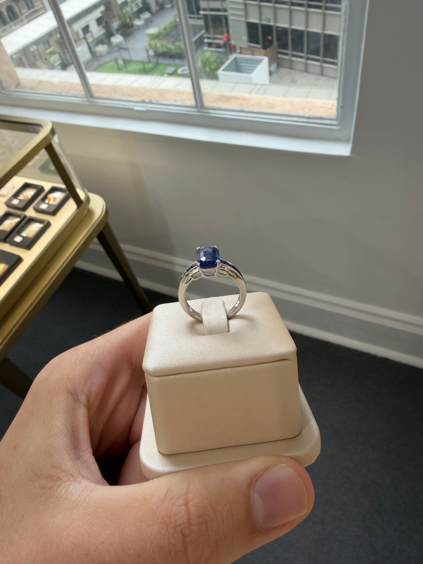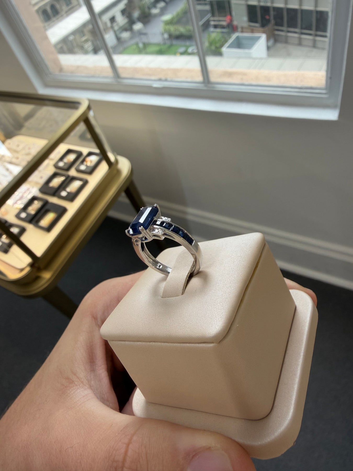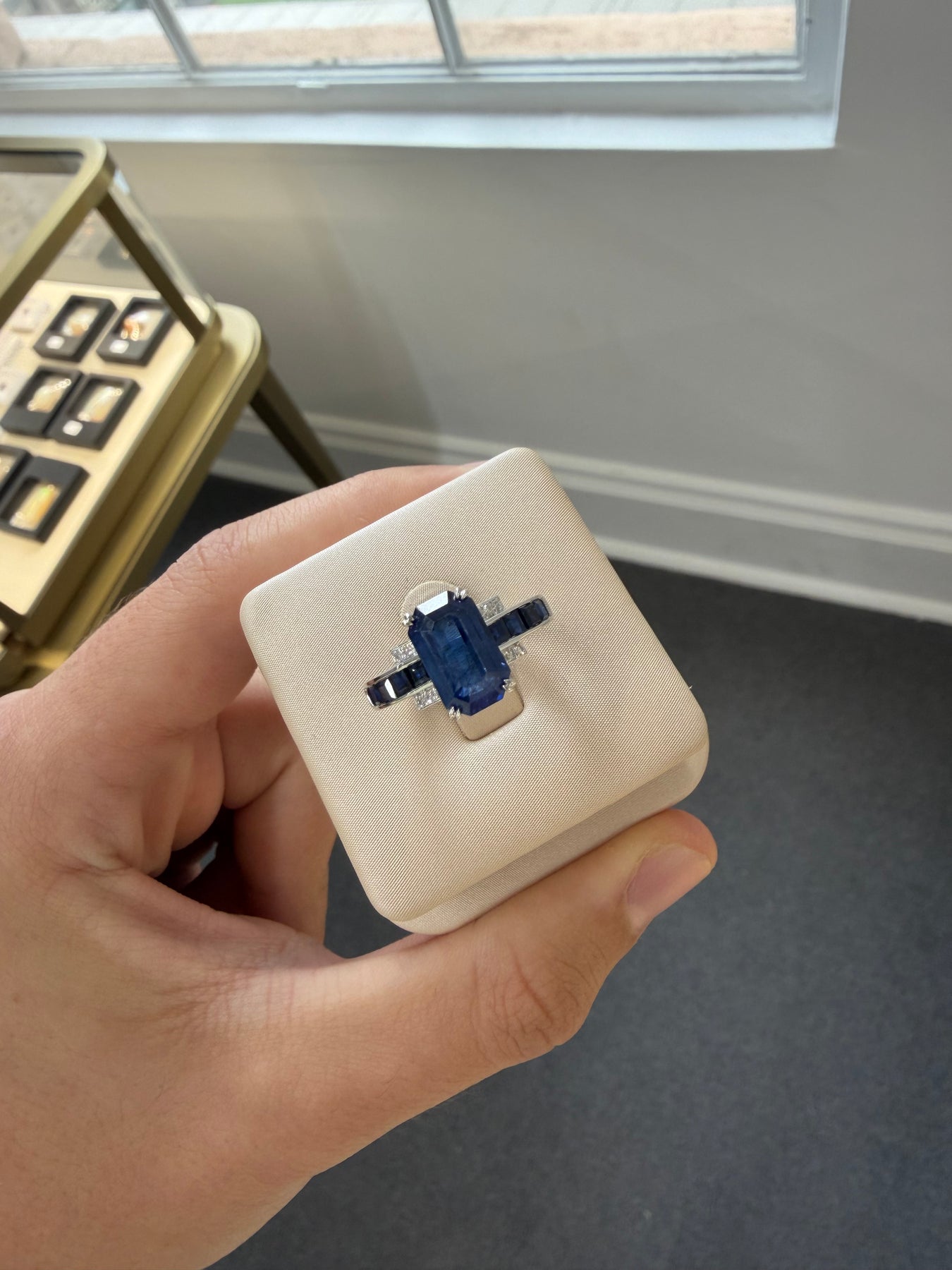 14ct white gold Ceylon sapphire and diamond dress ring featuring one (1) emerald shape four claw set sapphire on a basket setting with an upswept shoulder contain ten (10) square shape channel set sapphire along with twelve