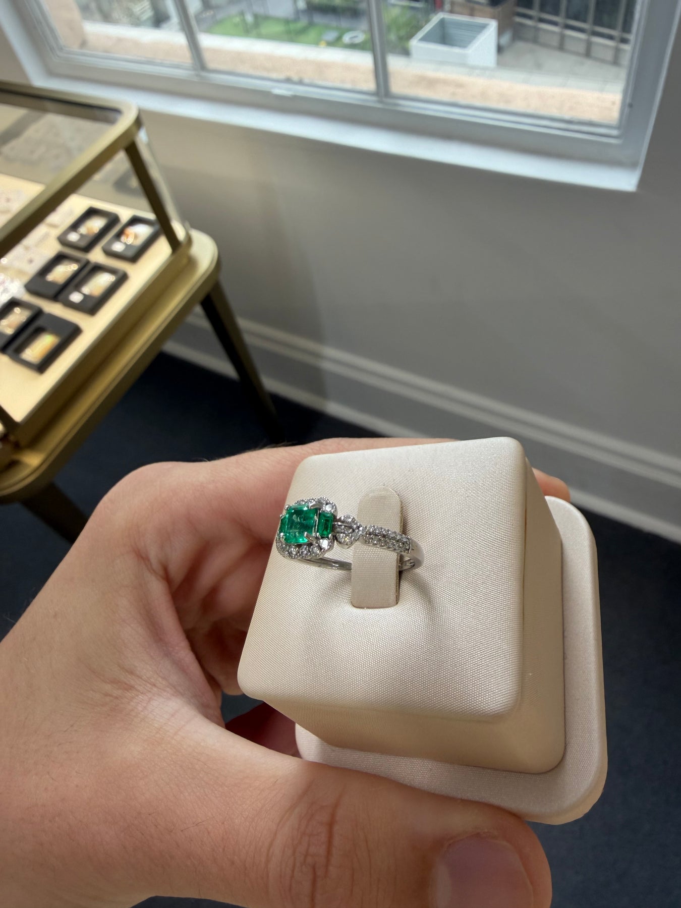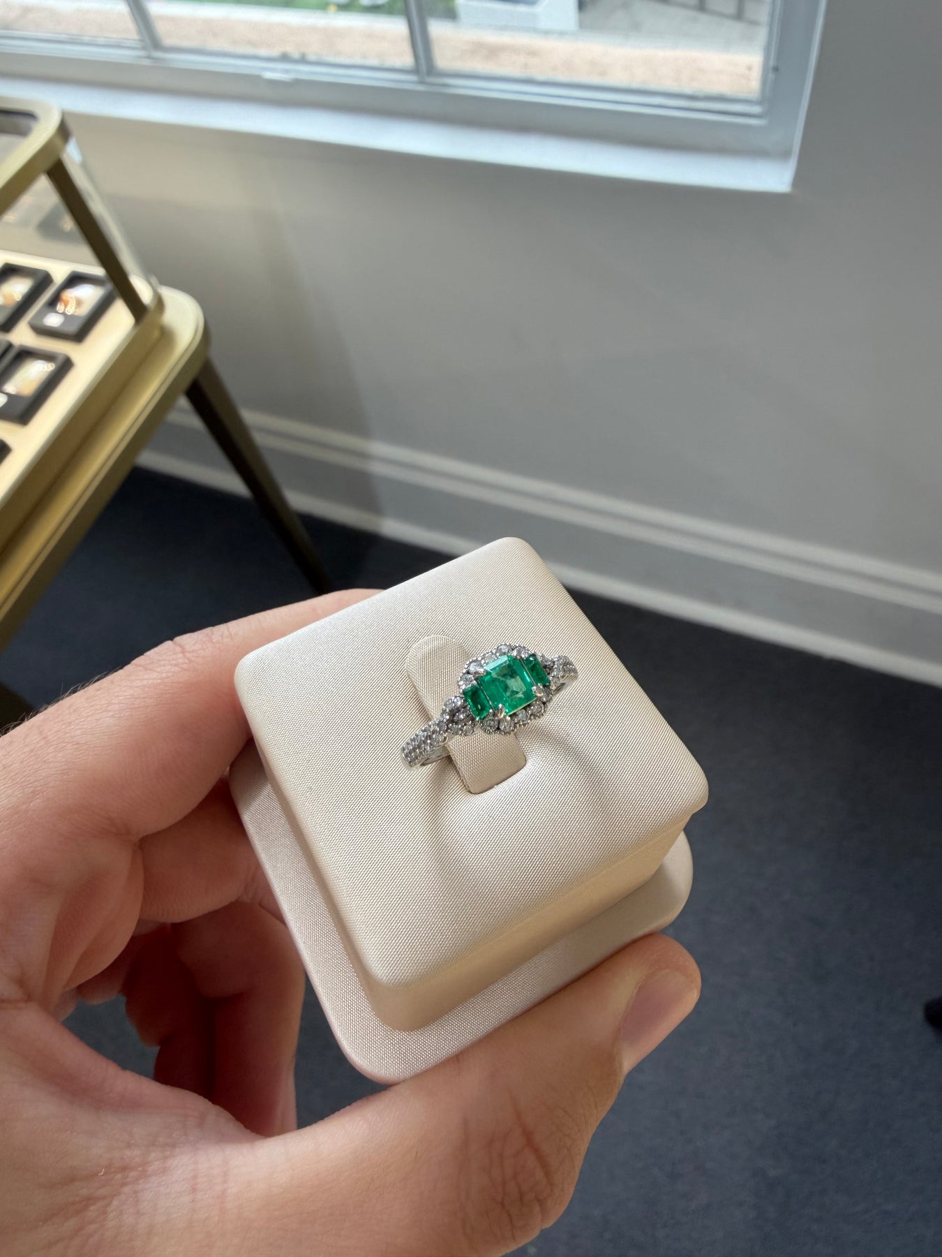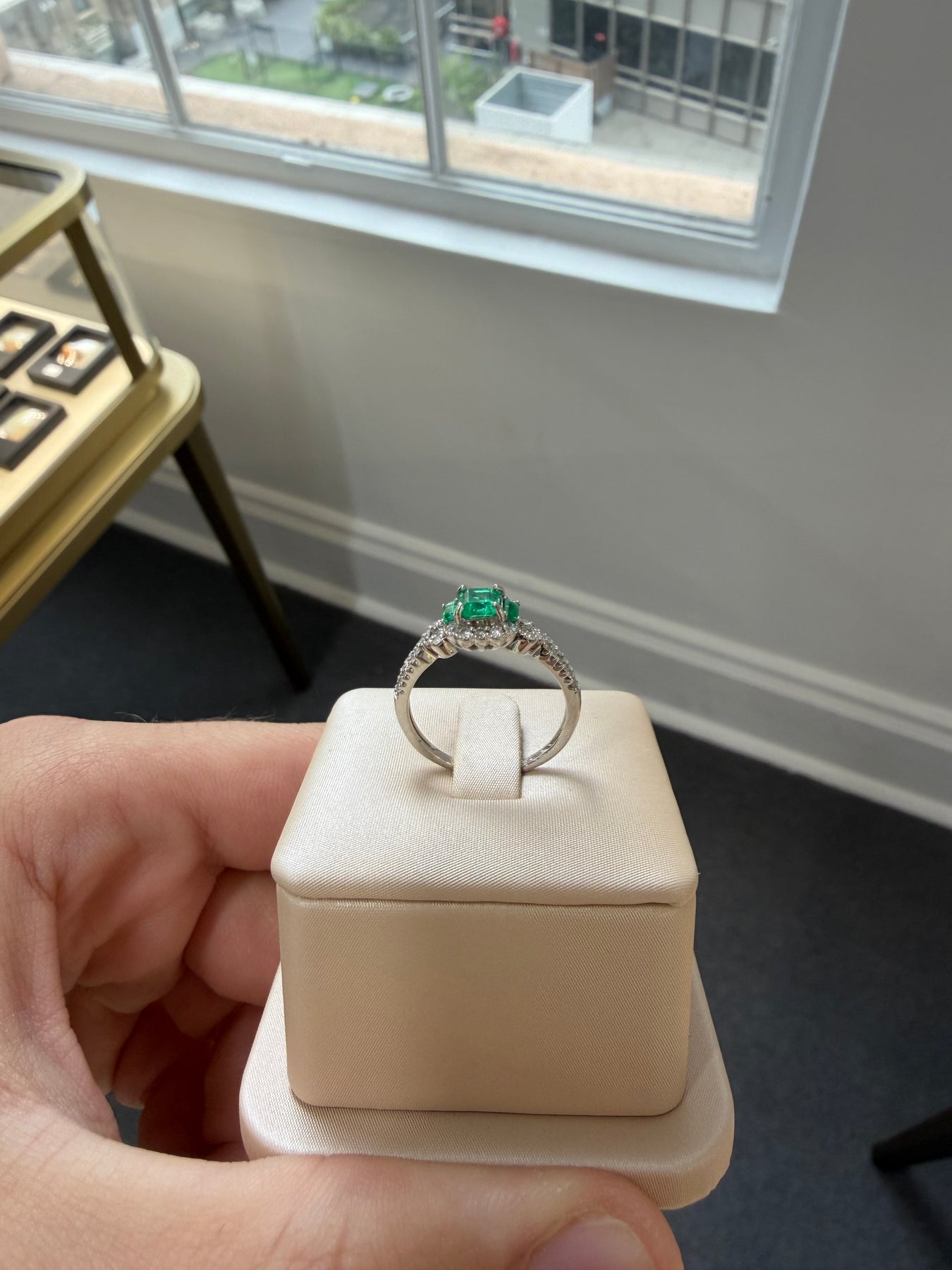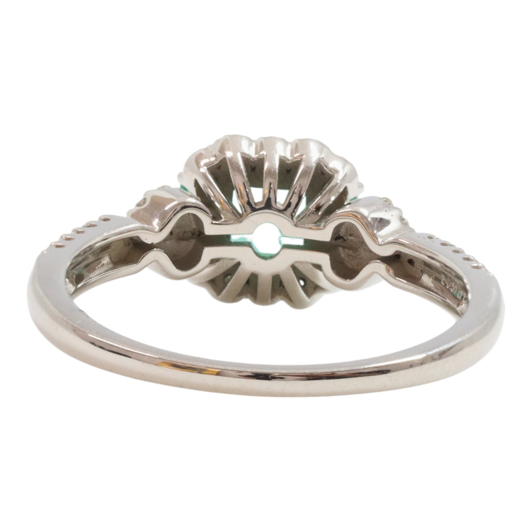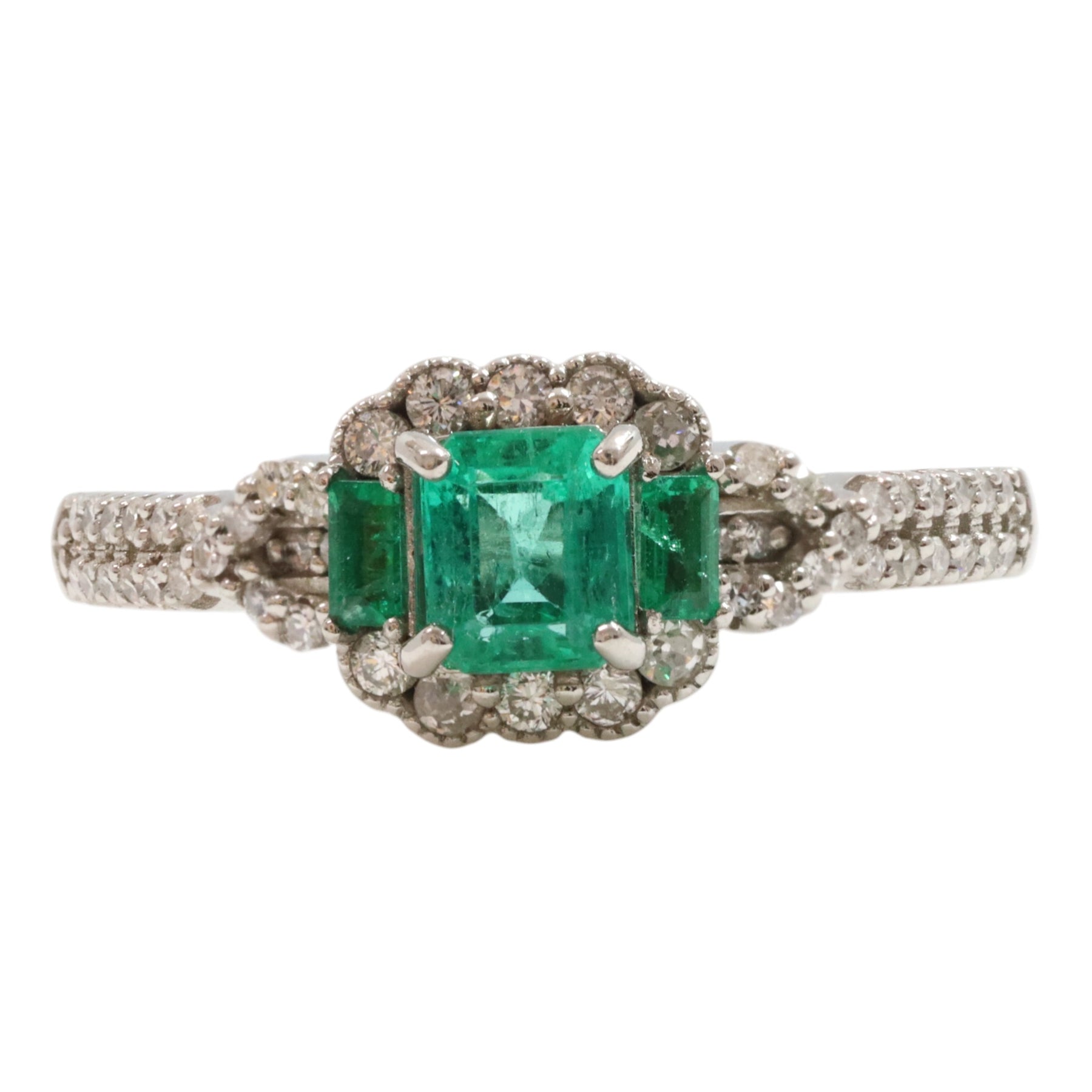 Platinum ladies ring featuring 4 claw set centre emerald cut natural Columbian emerald with 50 claw set natural single cut and natural round brilliant cut diamonds and 2 claw set emerald cut, natural Columbian emerald with a tapered shoulder and round edged shank, polished finish with milgrain edges.