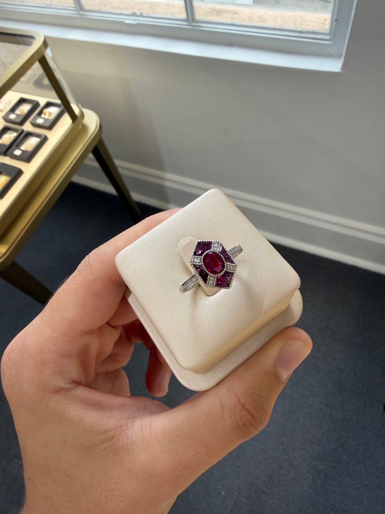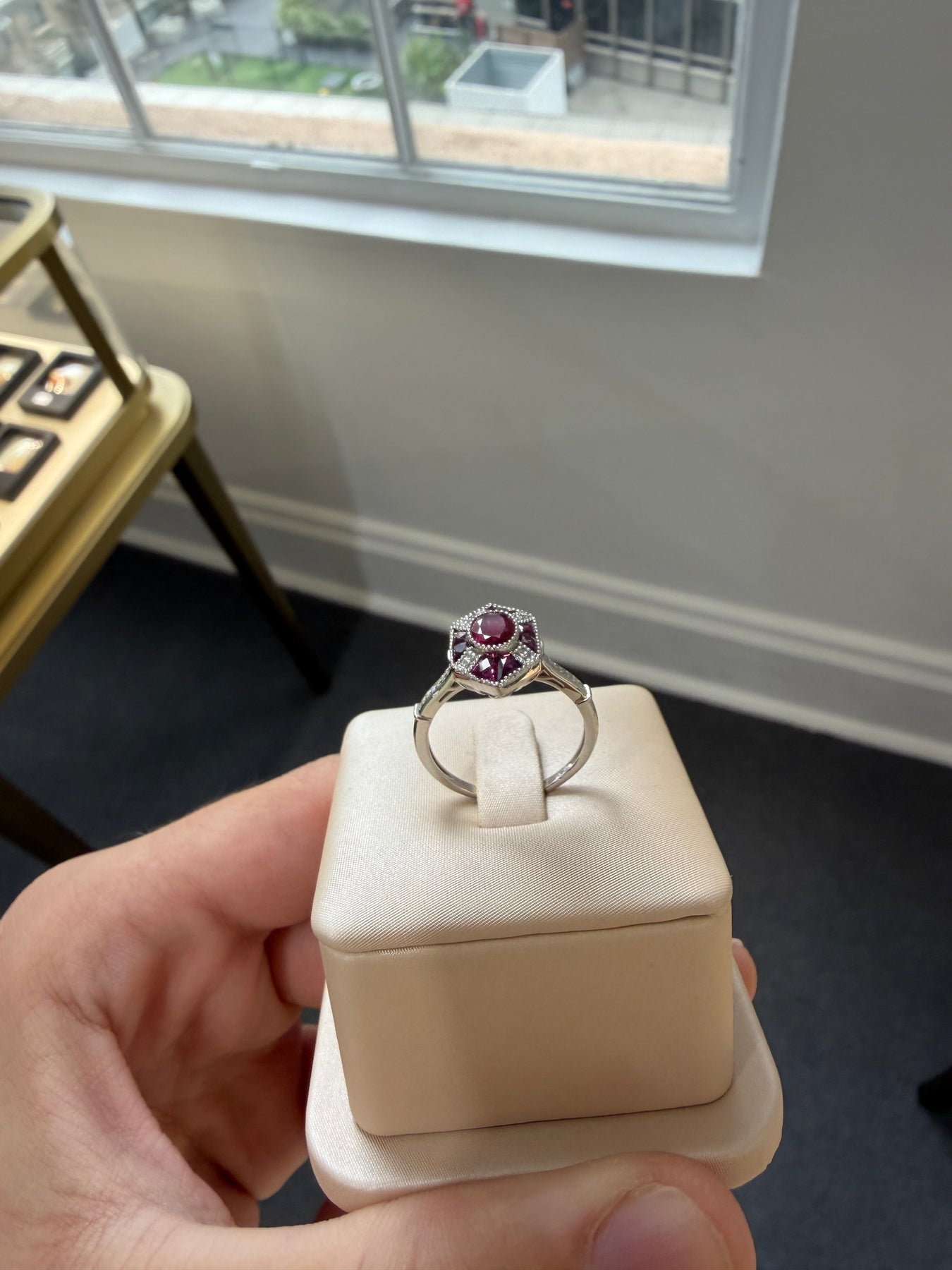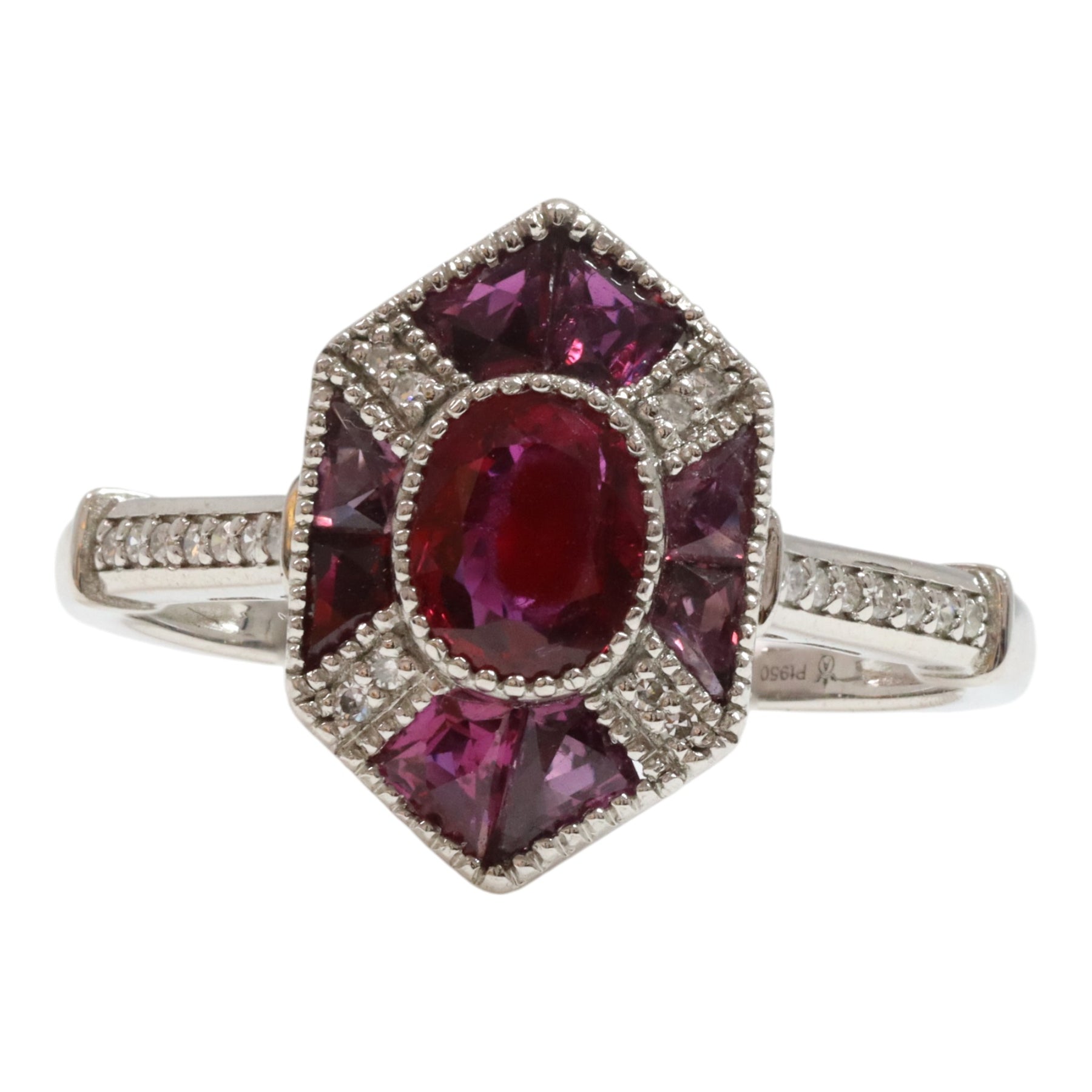 1 x Platinum ladies ring featuring 6 bezel set centre oval cut natural ruby surrounded byteaw setteet single cut diamonds and 8 invisible set fancy checkerboard trapezoid cut ruby with a taperet Bsurder aady ind engen shank, polished finish with migrain edges.