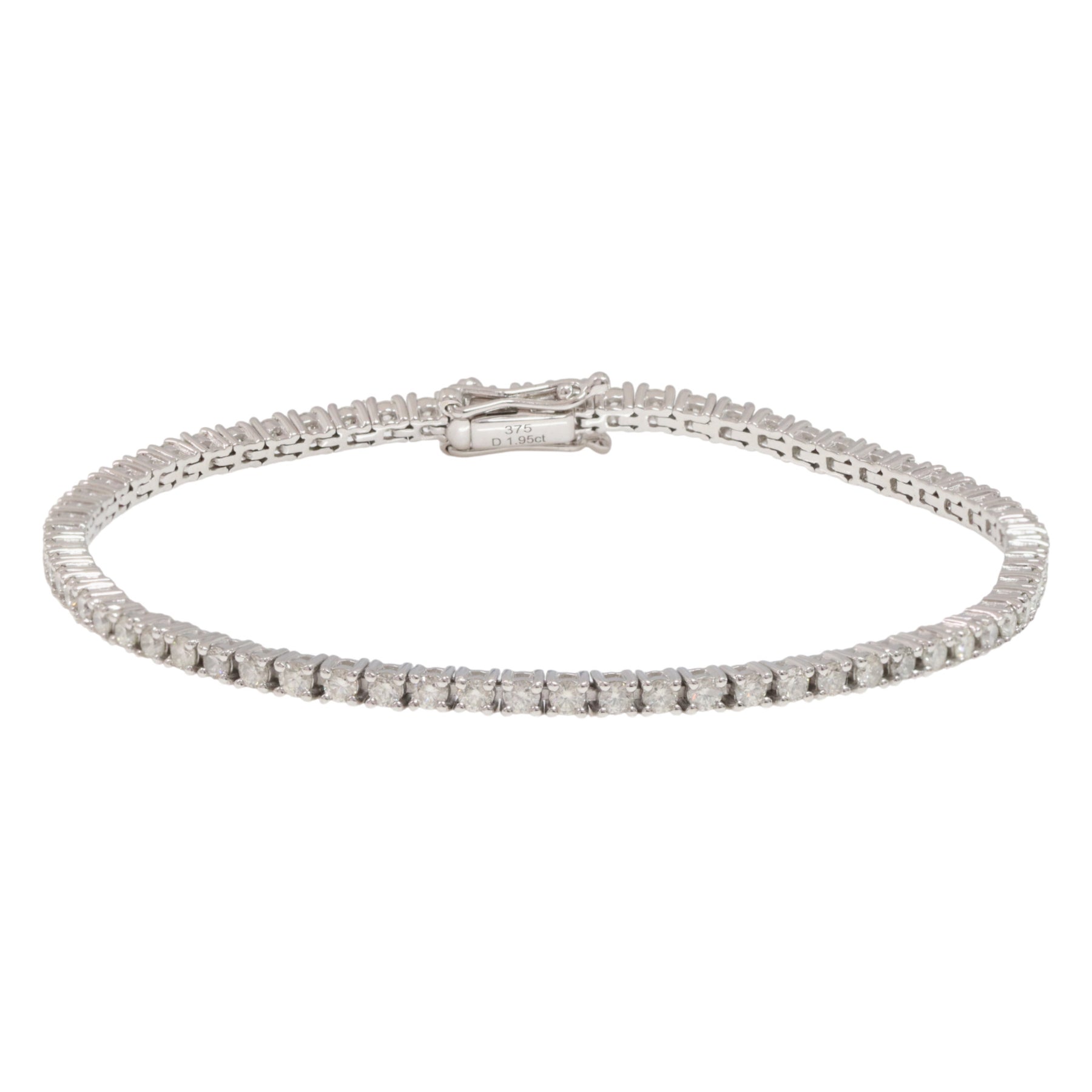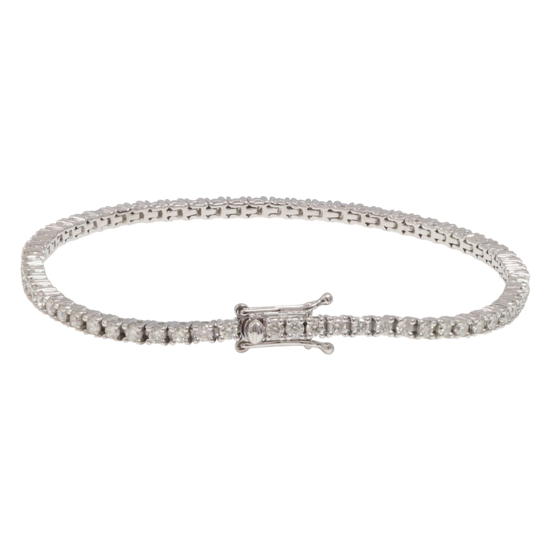 9ct white gold diamond tennis bracelet featuring sixty-eight (68) round brilliant cut four claw set diamond on a single row basket setting link together and secured by tongue and groove closure include safety catch.